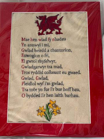 A colourful sampler with the national symbols of the dragon and daffodils supplied in a red mount.