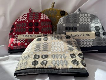 Tea Cosies made from Welsh heritage fabric and which can be supplied with the phrases 'Time for tea' or 'Amser i de' included in the cost