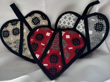 Heart shaped pot holders made from Welsh heritage fabric which provide a pretty and useful addition to the kitchen