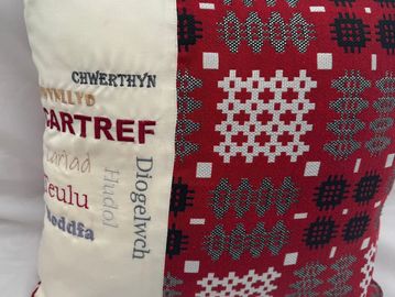 A cushion made with Welsh heritage fabric and wording that reminded me of what home means